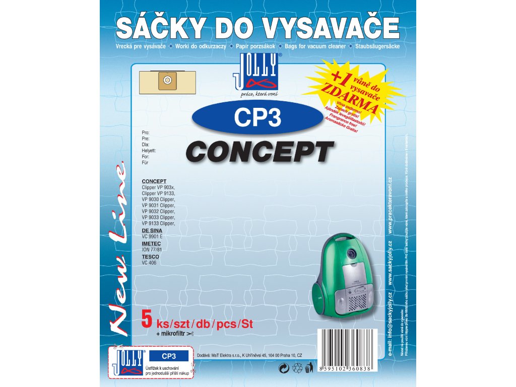 Papírové sáčky do vysavače CP3. Balení obsahuje 5 ks papírových sáčků CP3, vůni do vysavače zdarma, která krasně provoní Váš byt, mikrofiltr pro Váš vysavač.